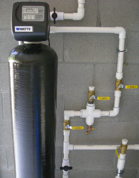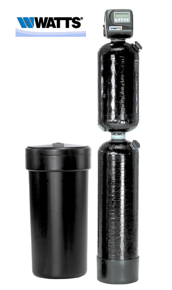 We're proud to be the EXCLUSIVE Watts® dealer The Watts Filox® media filter for iron and sulfur removal (explained above) does such a good job at filtering well water it is normally not necessary to install additional treatment equipment. But occasionally the water will have such a high TDS (total dissolved solids) content or be so hard that it requires additional water softening. The primary problem noticed with exceptionally hard water is spotting on dishes or on the glass shower door. Occasionally on a newly constructed home the cost of the entire water system, including filtering and softening, is well within the owners budget and he or she just wants to be sure that the water quality is the best possible. We install a complete range of water softening equipment at a very affordable price. The unit pictured here is a duel media water softener and filter. The lower section contains a media that softens the water and the upper section contains an activated carbon media for additional improvement in taste and clarity. |